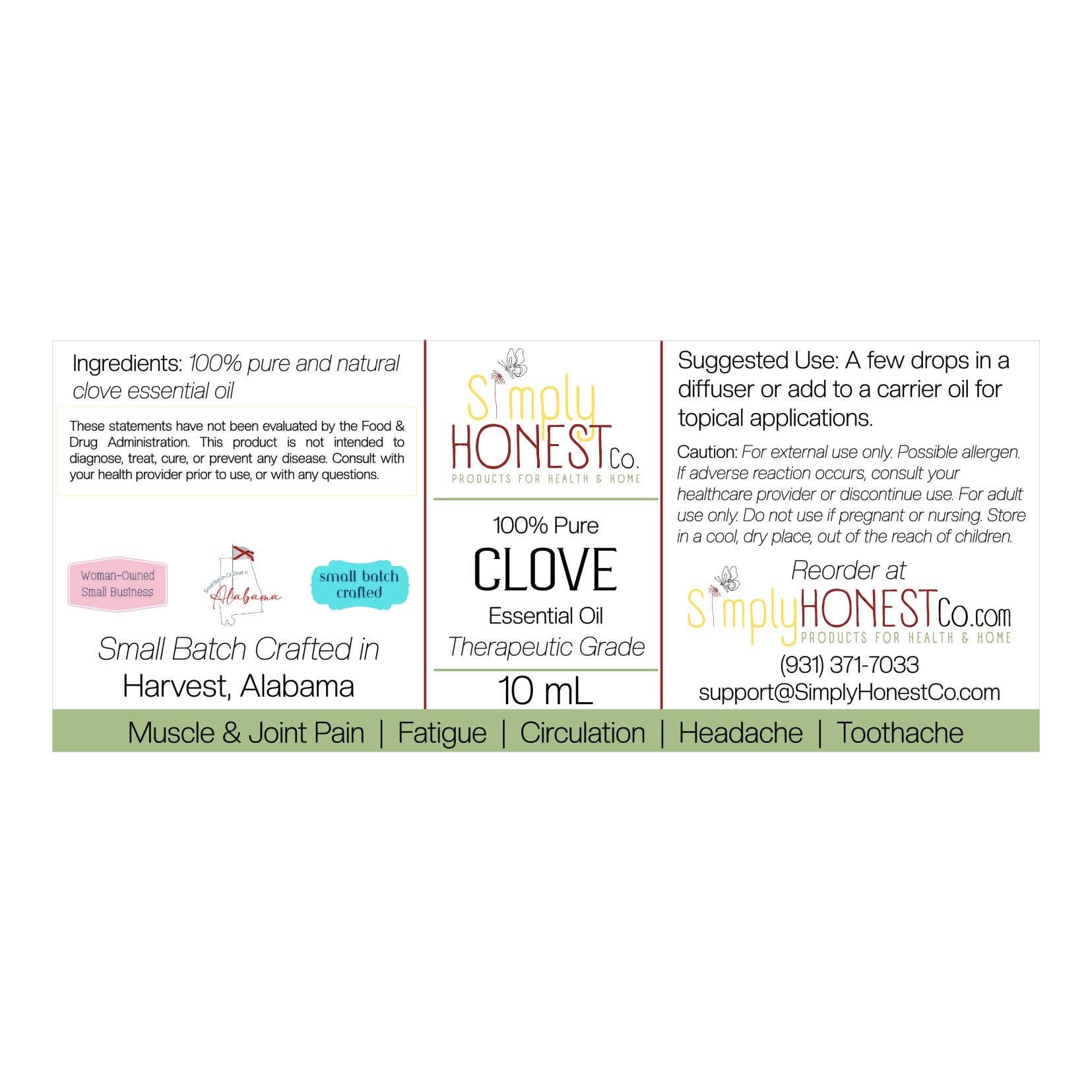 Clove Essential Oil is a natural and therapeutic product that offers numerous benefits. This powerful oil, extracted from the buds of the clove plant, can provide relief for muscle aches and pains, improve digestion and boost the immune system. Its soothing aroma also makes it perfect for aromatherapy. Item Details: * Packaged in glass bottles to maintain purity and extend shelf life * 100% pure * Undiluted * Therapeutic Grade Studies have shown and individuals have reported the following benefits of Clove Essential Oil: * Antimicrobial Properties * Dental Health Support * Pain Relief * Anti-Inflammatory Effects * Respiratory Health Support Who Should Not Use Clove Essential Oil: * Pregnant and breastfeeding women * Individuals with sensitive skin or skin conditions * People with bleeding disorders or on anticoagulant medications Safety for Pets: * Caution is advised with pets, especially cats and dogs * Proper dilution and consultation with a veterinarian are recommended Reco