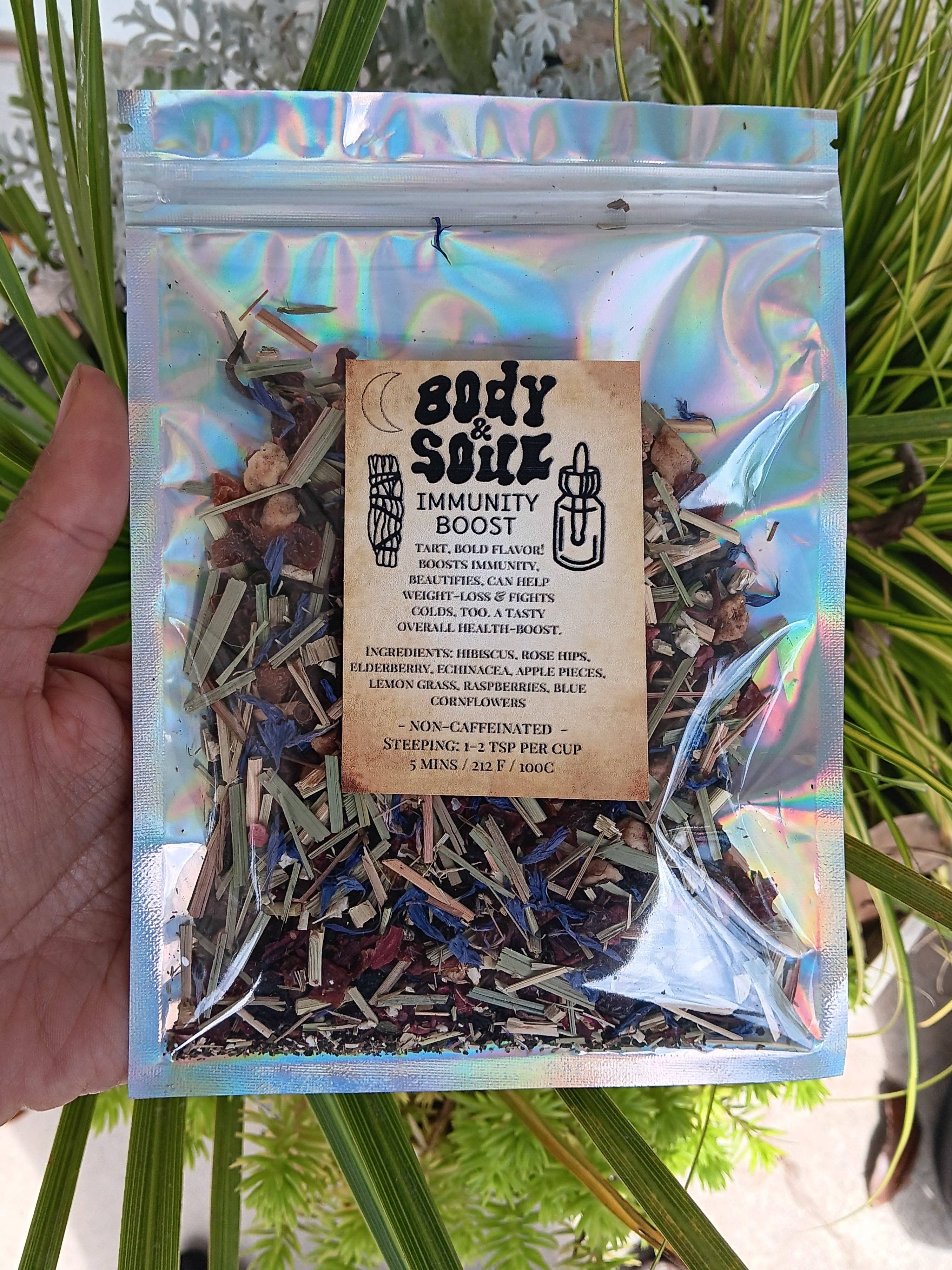 Boosts immunity with vitamin c rich elderberry, rose hips, and hibiscus. Can help fight cold/flu. Tart, bold flavor. Good for health overall as a daily health-boosting tea. Ingredients: Hibiscus, rose hips, elderberry, echinacea, apple pieces, lemon grass, raspberries, blue cornflowers