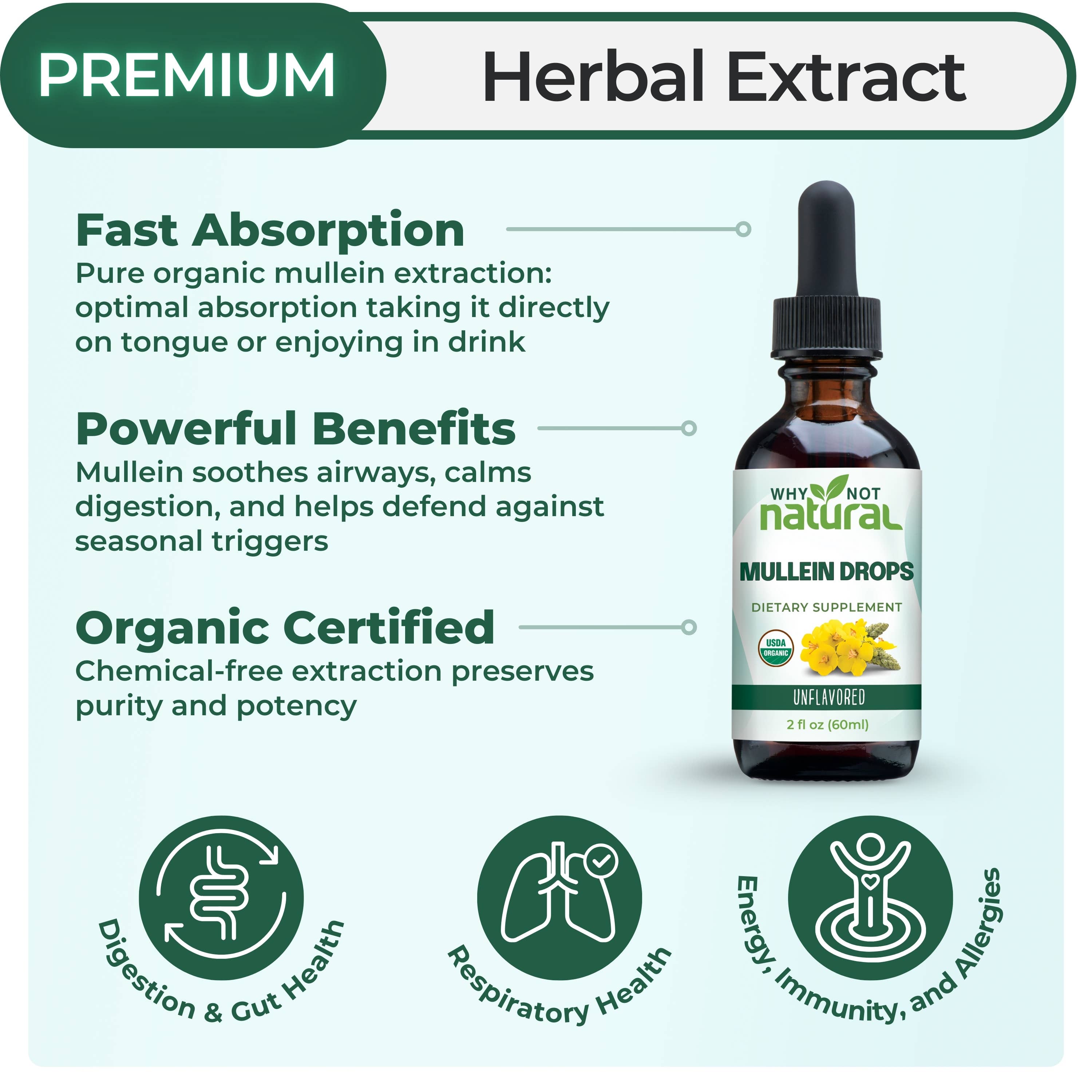 Certified Organic: Our USDA organic mullein contains only 3 ingredients. Breathe freely, knowing our lung cleanse drops are a traditional herbal remedy that’s pure, potent, and has no harmful additives. Deep Bronchial Support: Mullein leaf extract loosens mucus, cleanses the respiratory system, and helps you breathe more leisurely night and day. It also contains compounds that provide a protective coating to soothe the respiratory system. Allergies and Gut Health Support: Our vegan tincture provides seasonal allergy support and is not only easy on the gut - it’s known to improve gut health by creating a soothing coating, improving gut lining health and function, and supporting microbial balance, which provides additional allergy support.